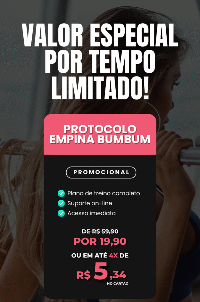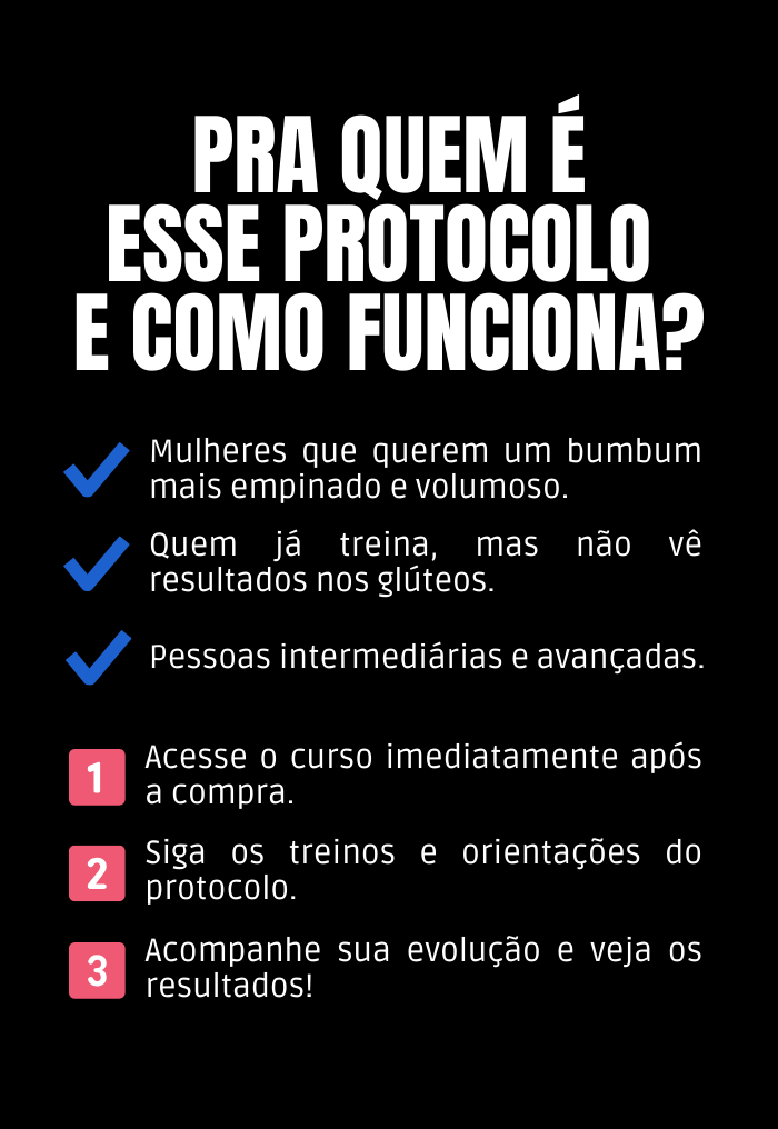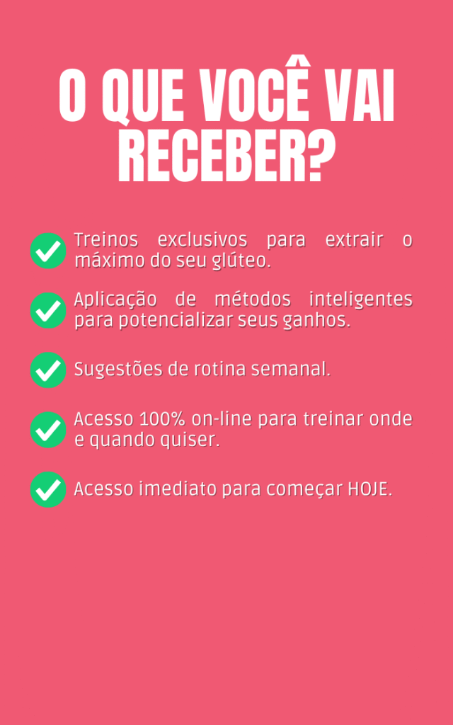 Não! Apesar do foco principal ser glúteos, o protocolo inclui exercícios para os outros grupos musculares de membros inferiores, membros superiores e abdômen, garantindo um corpo harmônico e funcional.